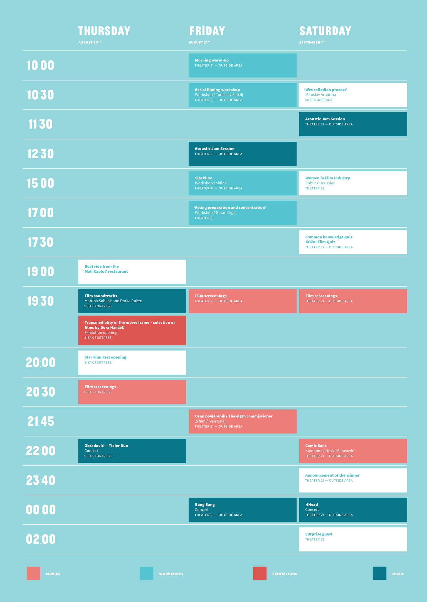 On the last day of the festival we will be working from morning hours. We’ll start the day with the “Wet Collodion Process” presentation by Miroslav Arbutina. During the day, an acoustic jam session will be organized for everyone to come with their instrument and play. In the afternoon we will have a public debate, “Women in Film Industry”, and later the visitors will be able to attend the film-oriented GNQ, general knowledge quiz, led by the stand-up legend Goran Vugrinec – Goc. After the quiz, we will finish the screenings, the Comic Sans movie and the winner of this year’s festival. We will end the night with 4Head’s concert and a surprise guest.