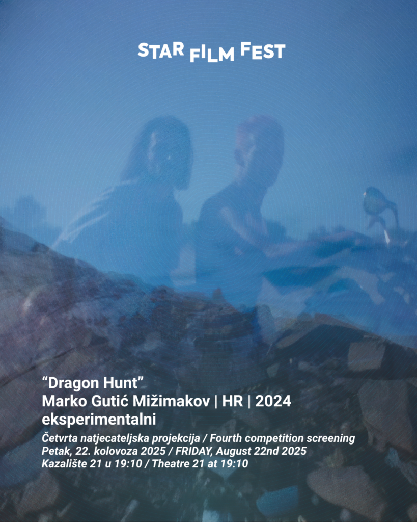 “Dragon Hunt” Marka Gutića Mižimakova, eksperimentalni film inspiriran tradicijom lova na zmajeve opisanom u romanu Samuela Delanyja “Zvijezde u mom džepu poput zrnaca pijeska”, kombinira strojno učenje, ples i queer putovanje kroz neobičan krajolik Dalmatinske zagore u istraživanje mimikrije, medijskog prijevoda i prijateljstva.